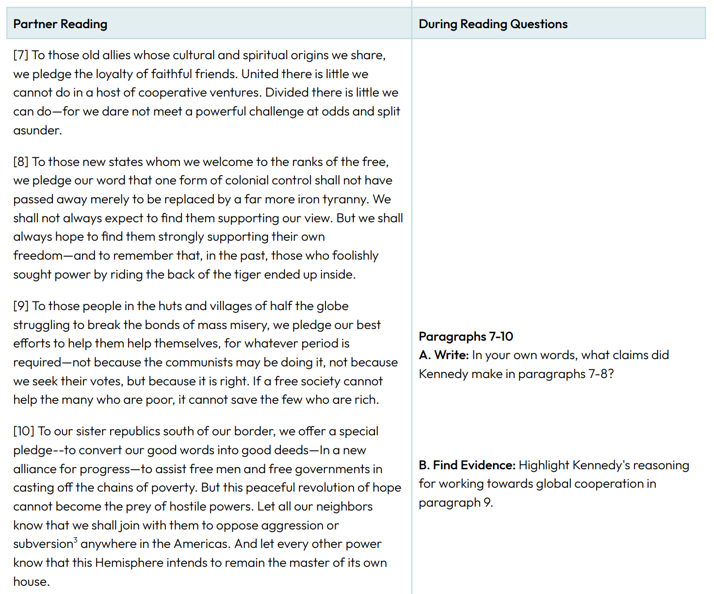 Whole Class Reading also offers an opportunity to provide key scaffolding with particularly challenging vocabulary or text structure; for example, 10th Grade Unit 4 Ed2.0 Voting Rights: Then and Now contains speeches that are high in complexity, like Dr. Martin Luther King's “Give Us the Ballot” and Lyndon B. Johnson's “We Shall Overcome.” For these lessons, we begin with Whole Class reading and During Reading questions to establish key skill and knowledge building, and then gradually release students to more independence as the text moves on.